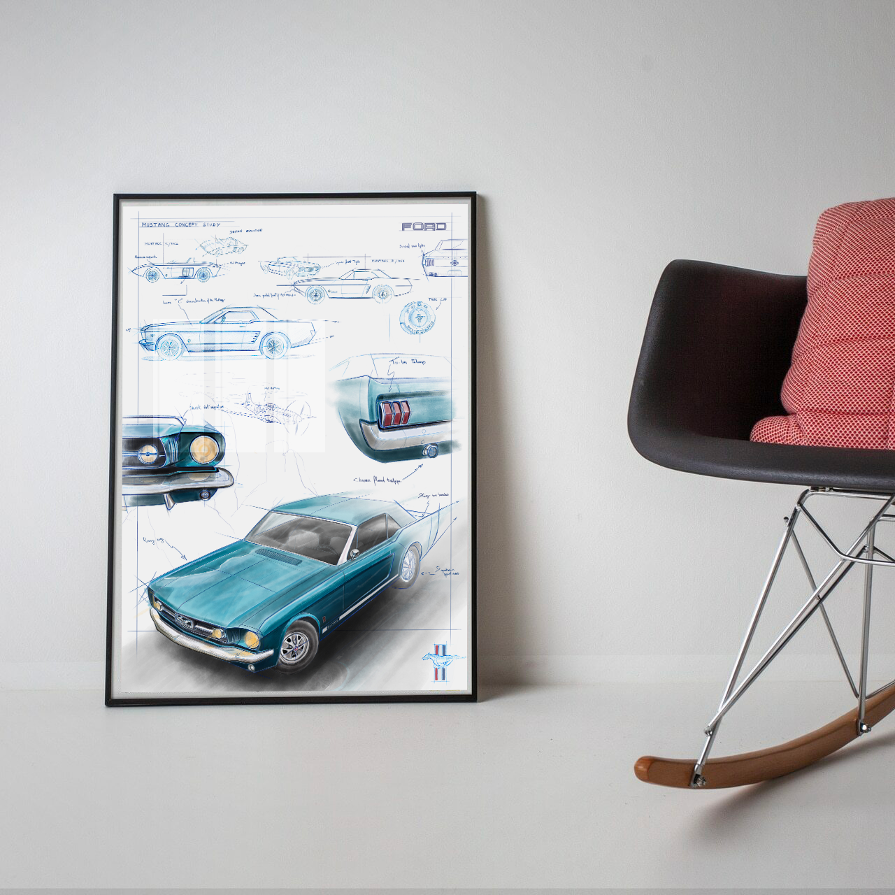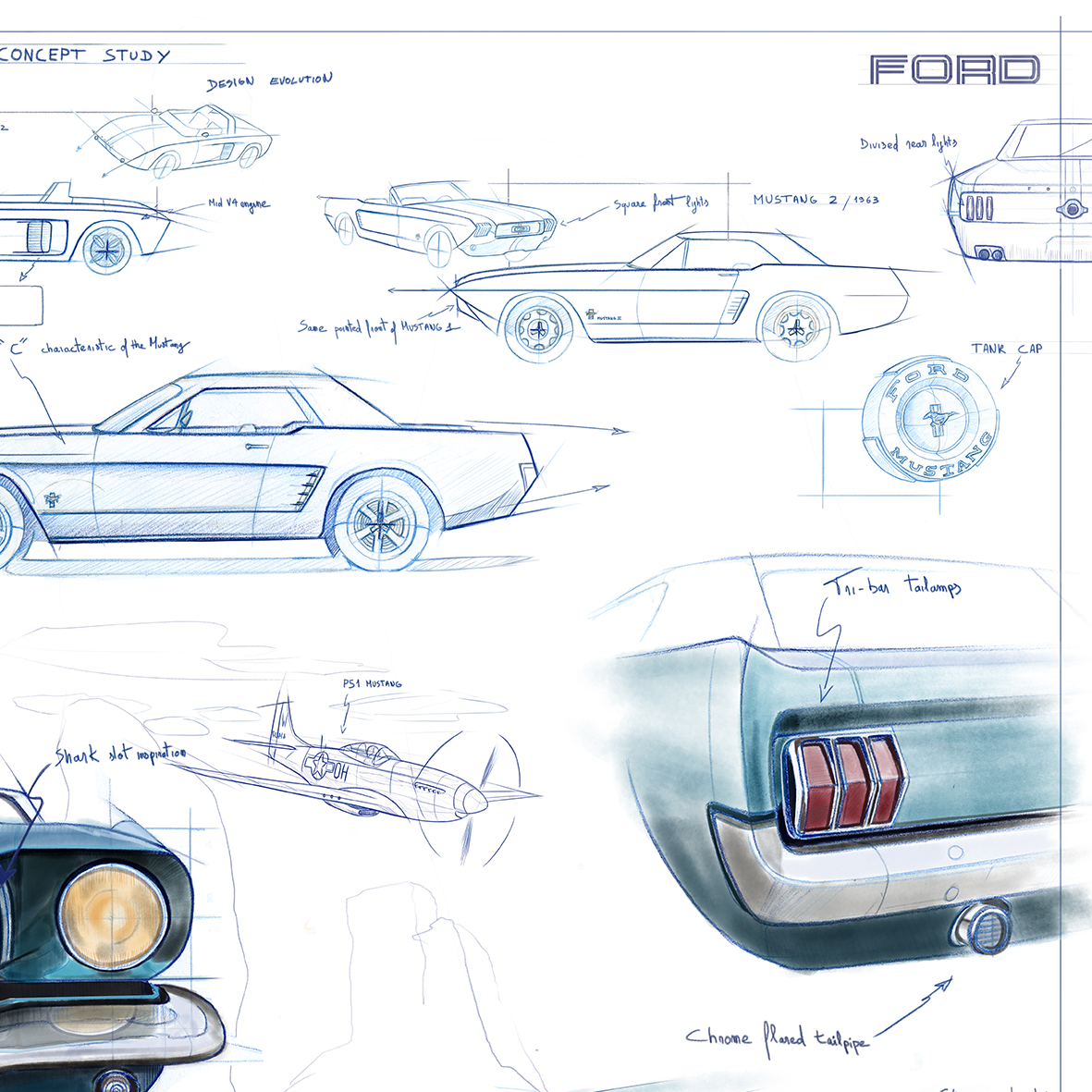 Par exemple, l'artiste a fait le choix de représenter le concept Mustang 1 et 2 pour montrer l'évolution du style et les choix des designers.