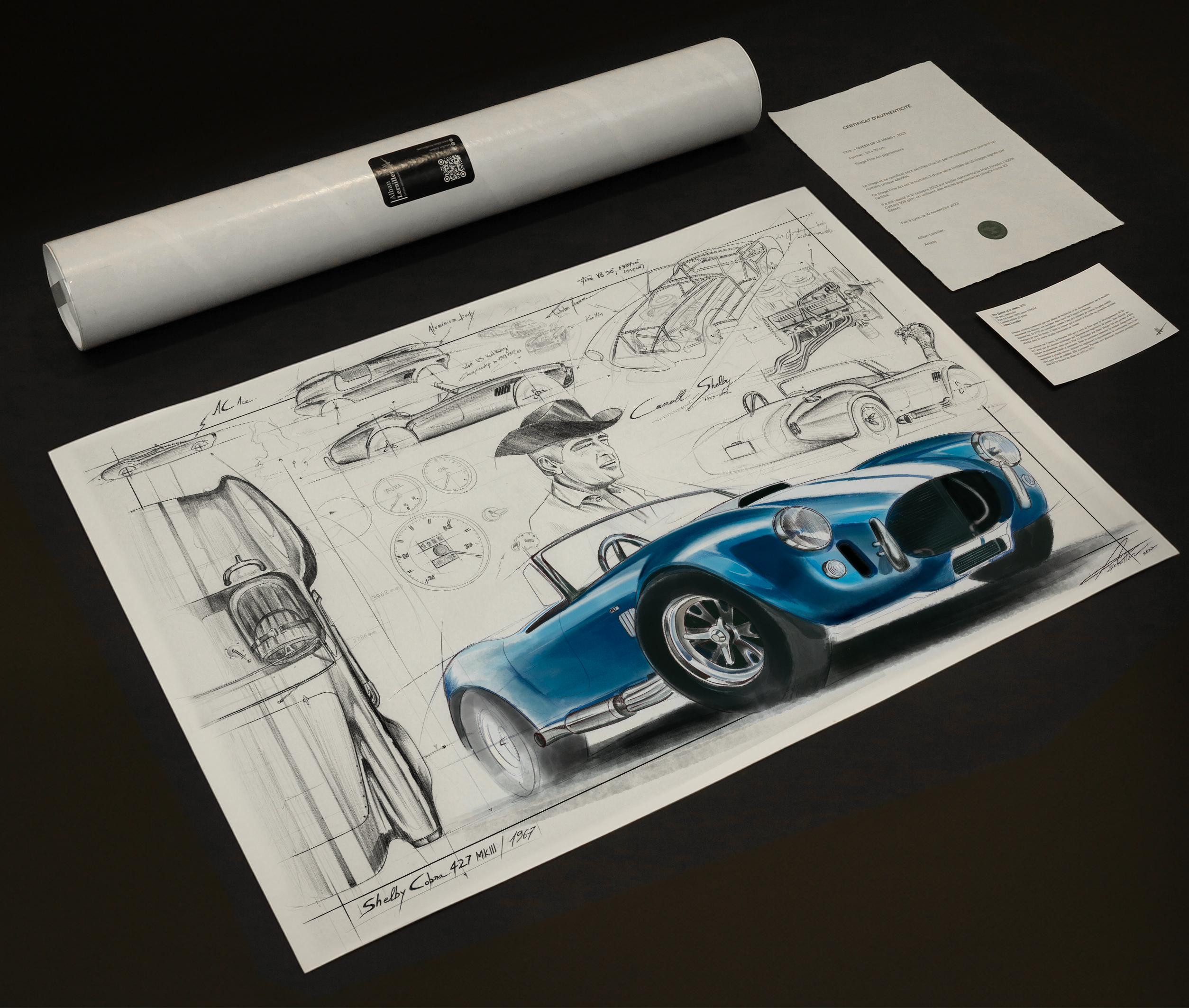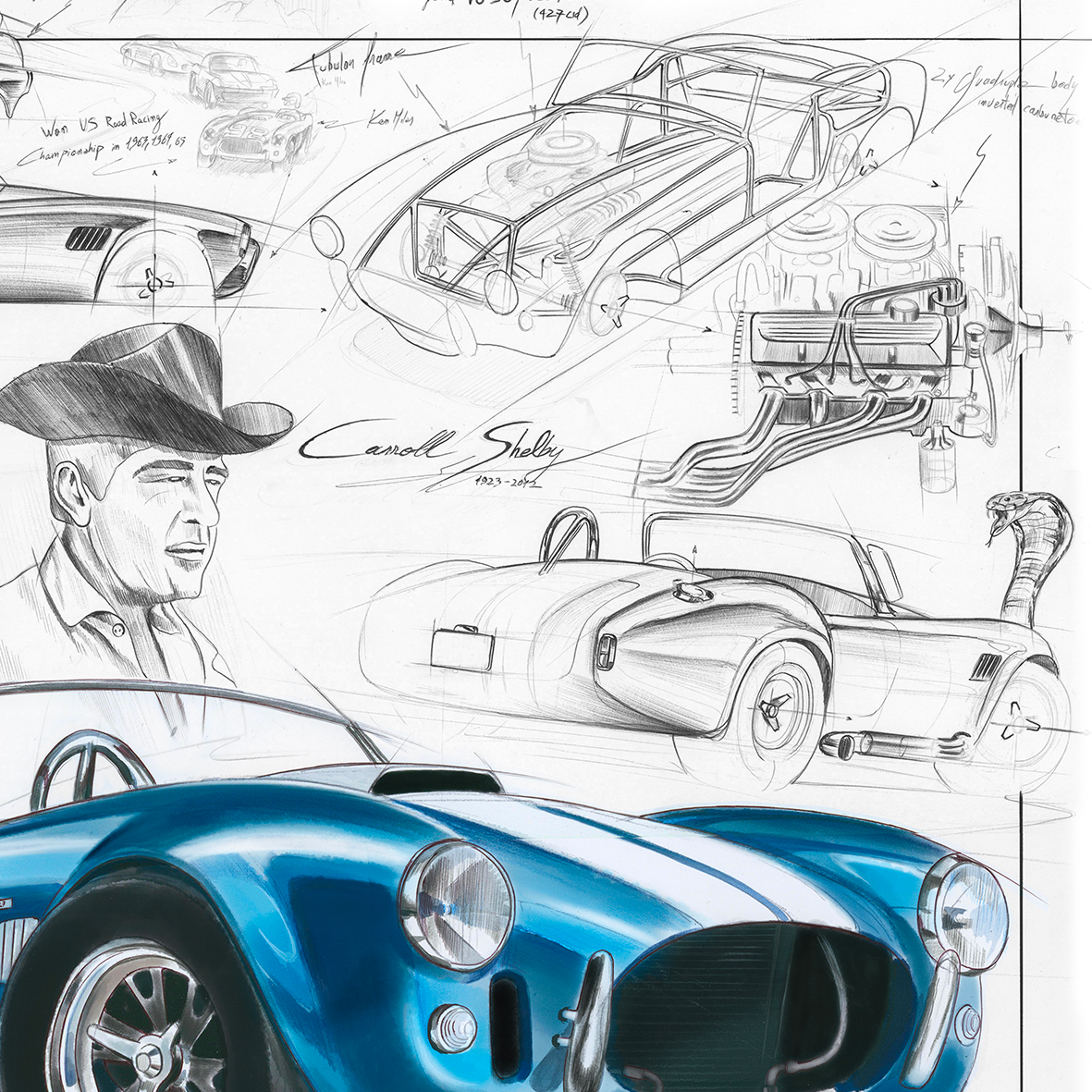 C'est le modèle, le "427", que l'artiste a choisi de représenter, avec des éléments de son histoire tels que la carrosserie AC Bristol, son moteur V8 Ford et son châssis tubulaire. On peut également voir un croquis d'une course du championnat américain, ainsi que le symbole emblématique de Carroll Shelby, le serpent Cobra du Texas.