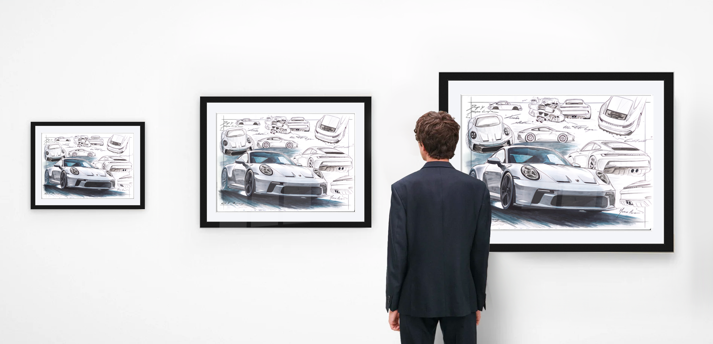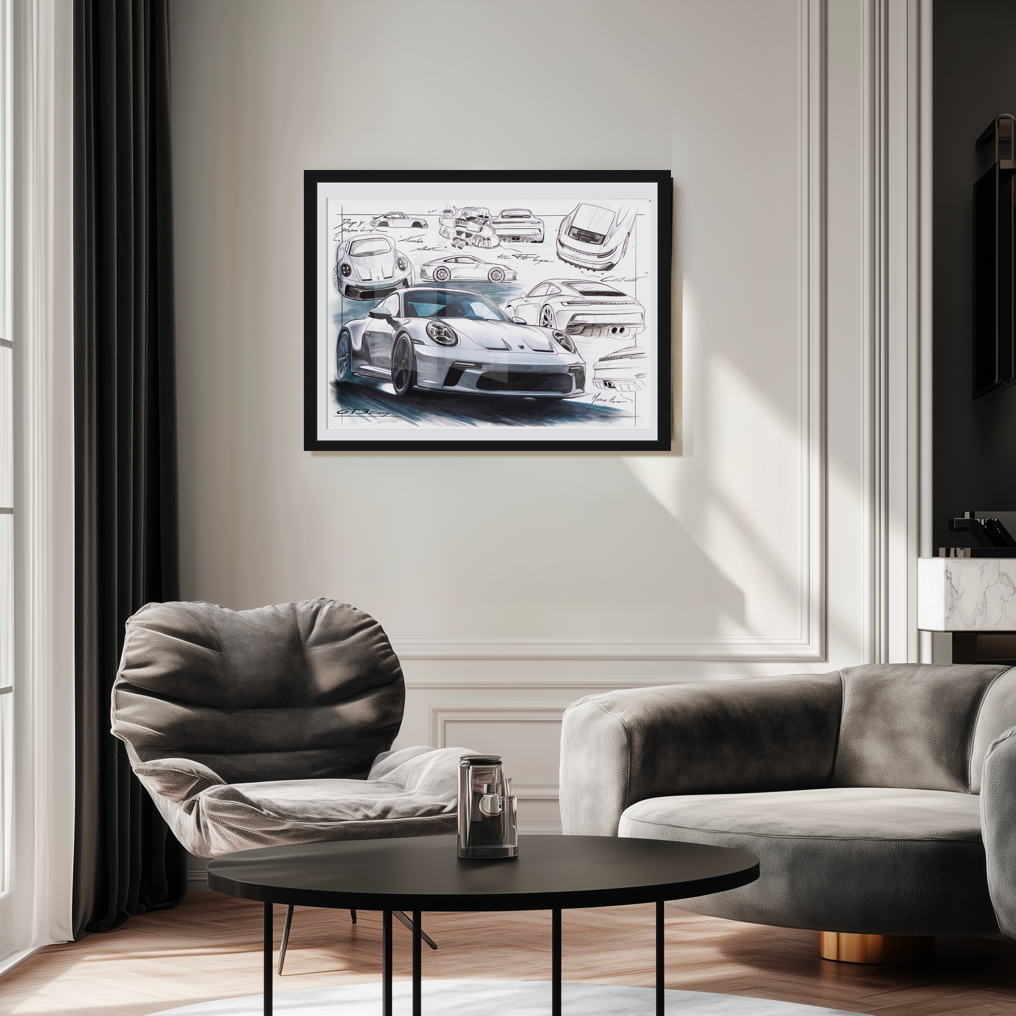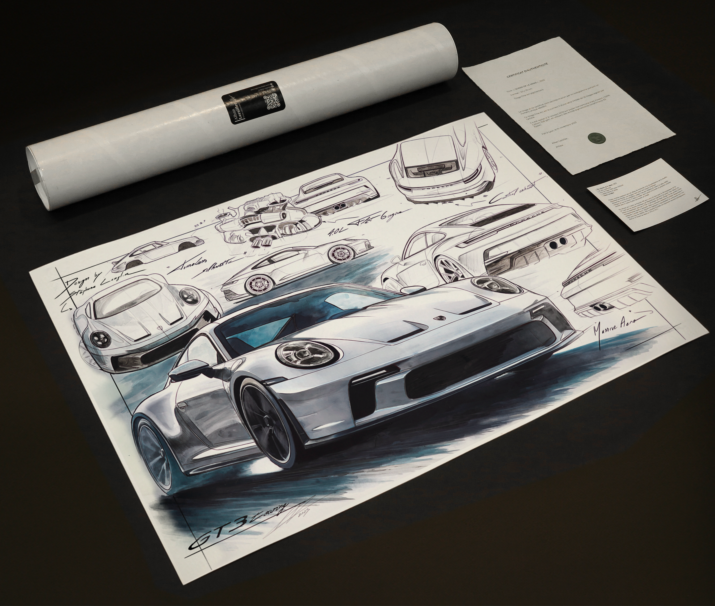 Comme la voiture, le tableau privilégie la sobriété et la justesse. Chaque trait traduit la recherche d’un équilibre parfait entre puissance, élégance et émotion — l’essence même de la GT3 Touring.